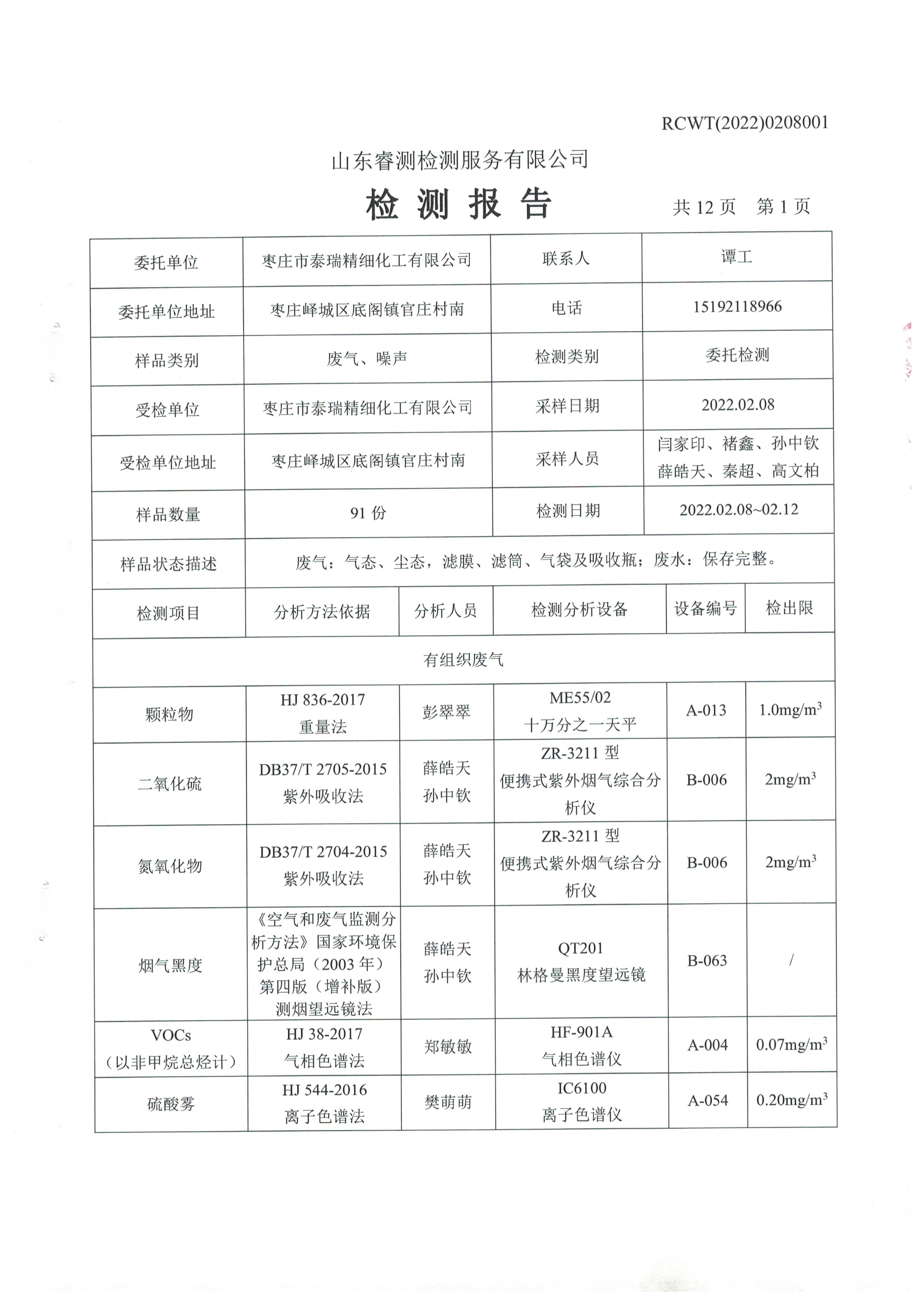 2022年2月份及第一季度自行檢測報告